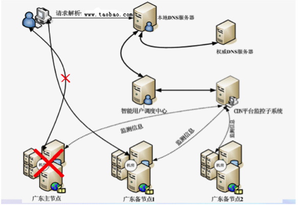 現(xiàn)在CDN有兩個(gè)維度可以進(jìn)行調(diào)度。一是地域的概念,比如說(shuō)你去瀏覽器里面輸一個(gè)www.taobao.com,域名查詢請(qǐng)求會(huì)提交到運(yùn)營(yíng)商本地的DNS服務(wù)器,DNS服務(wù)器有一個(gè)迭代查詢的過程,最后到了調(diào)度中心。調(diào)度服務(wù)器會(huì)根據(jù)源IP。比如你是北京電信的DNS的IP,就將你調(diào)度到北京電信的機(jī)房去。二是CDN是有高可用性的,調(diào)度中心在不停的監(jiān)控所有節(jié)點(diǎn)的健康狀況,一旦發(fā)現(xiàn)這個(gè)節(jié)點(diǎn)有問題,會(huì)將用戶切換到另外一個(gè)節(jié)點(diǎn)。