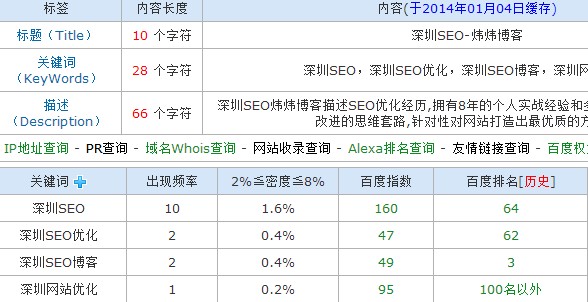 通過(guò)上面圖片可以清晰的分析煒煒?biāo)龅年P(guān)鍵詞都是一般性詞,而不是很熱門(mén)詞;但是為什么"深圳SEO博客"排名到了首頁(yè),而其他的都是沒(méi)有獲取很好的排名呢?是因?yàn)殛P(guān)于該關(guān)鍵詞的競(jìng)爭(zhēng)度高不高的問(wèn)題,其他的那些關(guān)鍵詞都是需要一定的時(shí)間成本才能獲取很好的排名。所以我們?cè)谟^察關(guān)鍵詞的排名的時(shí)候同時(shí)也是需要觀察競(jìng)爭(zhēng)對(duì)手的多與少問(wèn)題。