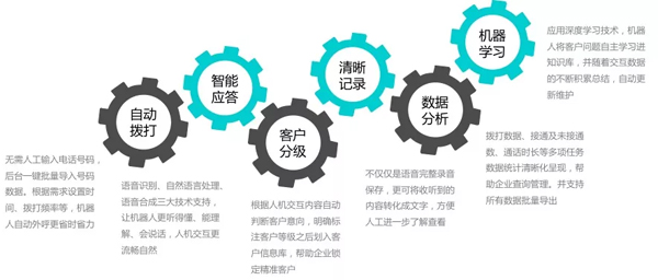 另一方面,人工智能技術雖然還有待提升,然而在諸如海量線索營銷、簡單業(yè)務提醒等特定場景下,機器人的能力和效率卻是遠高于人類的。目前的外呼機器人產(chǎn)品,底層的自然語言理解、上下文關聯(lián)、語音識別、語音合成等技術已經(jīng)較為成熟,機器人是可以替代人工完成部分海量、簡單工作的。