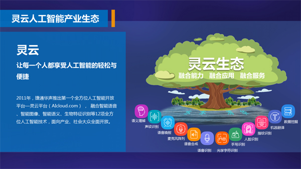作為人工智能產(chǎn)業(yè)開拓者與領(lǐng)導(dǎo)者,捷通華聲自2000年成立以來,一直從事AI核心技術(shù)的研究與產(chǎn)業(yè)化應(yīng)用,是中國最早從事智能語音、智能圖像研究與應(yīng)用的企業(yè)之一。2011年,捷通華聲推出國內(nèi)外第一個全方位人工智能開放平臺—靈云平臺(AIcloud.com),融合智能語音、智能圖像、智能語義、生物特征識別等12項全方位人工智能技術(shù),面向產(chǎn)業(yè)、社會大眾全面開放,服務(wù)企業(yè)上千家。