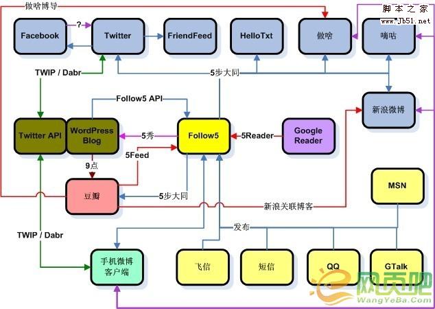 有點眼暈嗎?我第一次看見這張圖的時候也是相當暈。Follow5.com恐怕是目前國內(nèi)市場上支持同步功能最全面的微博了,也是“同步控”們的最愛。本文就以Follow5微博作為本文使用的網(wǎng)站。