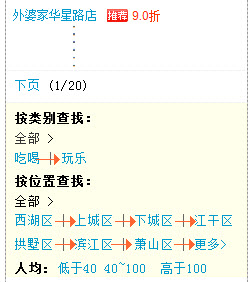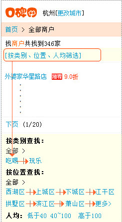 優(yōu)點:利于重復(fù)篩選。如用戶想選“西湖區(qū)的吃喝”或者“杭州地區(qū)的商城”,先選擇其中一個條件,頁面刷新后,在頁面頂部再選 擇另一個條件,會易于操作。