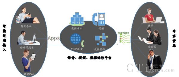 在服務(wù)端,依托IT基礎(chǔ)設(shè)備構(gòu)建統(tǒng)一的語音、視頻和數(shù)據(jù)協(xié)作的通訊平臺,將各類專家資源進行整合接入該平臺,為智能移動終端用戶提供專家服務(wù),在充分利用專家資源提供專業(yè)服務(wù)的同時為客戶提供全天候的按需服務(wù)體驗,同時提升客戶滿意度。