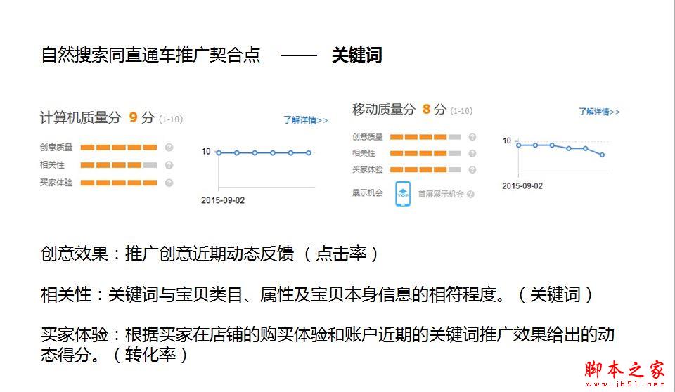 而關(guān)鍵詞的質(zhì)量得分,大概分成三個(gè)方面,這三者是息息相關(guān)的。在點(diǎn)擊率方面需要細(xì)分,有歷史點(diǎn)擊率和實(shí)時(shí)點(diǎn)擊率,一般直通車開(kāi)了比較久,歷史數(shù)據(jù)不會(huì)太差,平均點(diǎn)擊花費(fèi)也會(huì)降低,做好直通車不是太難,只要做好產(chǎn)品和服務(wù),一天上首頁(yè),幾天內(nèi)讓質(zhì)量得分上十分都不是難事,但是要看能不能保持。