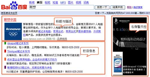 廣告的格式有兩種,一種是混合在正常搜索結(jié)果中,結(jié)尾標(biāo)識(shí)“推廣”,例如搜索“微軟”,一種是類似Google的廣告形式,以淡灰色為背景的矩形框,標(biāo)記“贊助商鏈接”,例如搜索“用友”。