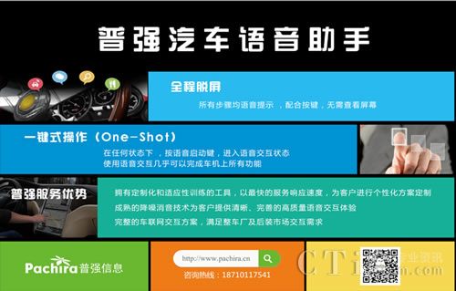 普強(qiáng)汽車語音助手是基于普強(qiáng)公司自主研發(fā)的“千語”語音識別引擎,開發(fā)出的一款符合駕車行駛使用的語音助手產(chǎn)品,提供語音合成、語音聽寫、語音識別、信息查詢、電話短信、導(dǎo)航、語音控制車體功能、語音操作第三方軟件、車聯(lián)網(wǎng)(信息娛樂檢索功能)等功能。主要針對各類車機(jī)系統(tǒng)提供利用語音交互方式進(jìn)行通訊、導(dǎo)航、娛樂、車況查詢、信息服務(wù)等功能操作的產(chǎn)品,它是利用人與車通過語音交互來滿足開車過程中的用戶需求,同時讓用戶在駕駛過程中無需動手也能全面體驗(yàn)互聯(lián)網(wǎng)的樂趣。