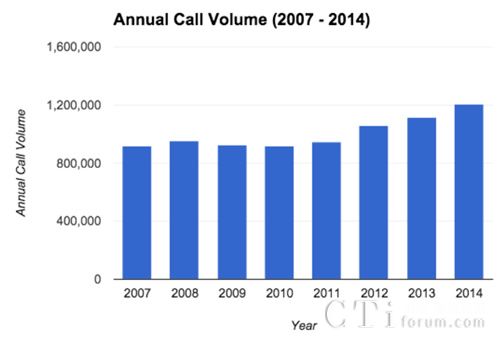 從2007年開(kāi)始,呼叫中心每年接到的報(bào)警電話在90萬(wàn)次左右,有些年份還有降低,但是從2011年開(kāi)始,報(bào)警電話的數(shù)量開(kāi)始持續(xù)增長(zhǎng)。2014年,呼叫中心接到了120萬(wàn)次報(bào)警電話,比2011年增長(zhǎng)了28%。與此同時(shí),呼叫中心的警員數(shù)量并沒(méi)有這么大幅度的增長(zhǎng),大家疲于奔命也就很好理解了。