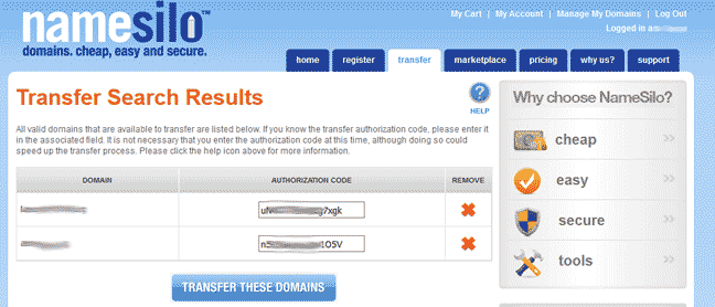 這里我們需要核對當(dāng)前域名的轉(zhuǎn)移碼信息,然后點(diǎn)擊Transfer these domains按鈕繼續(xù)。