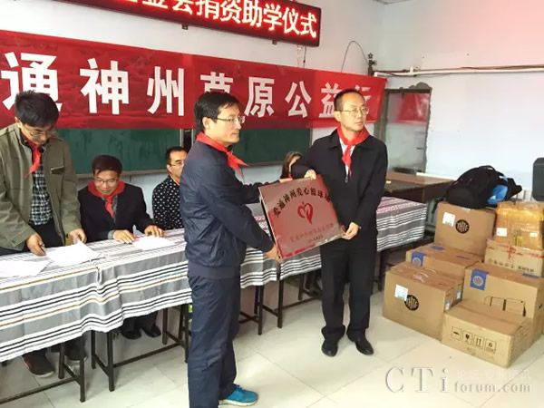 北京信普飛科科技有限公司張萍代表愛通神州助學(xué)基金向郝車倌小學(xué)捐贈(zèng)三萬余元的物資。