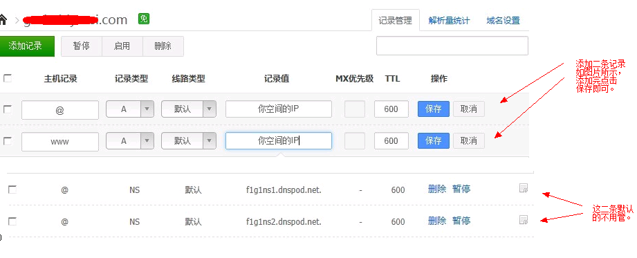 以DNSPOD為例子,下面是DNSPOD的解析教程:
