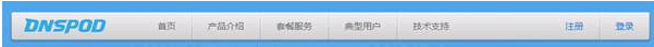 訪問http://www.dnspod.cn網(wǎng)站,在DNSPod官網(wǎng)首頁的右上角,有【注冊】,如下圖所示,點擊【注冊】按鈕