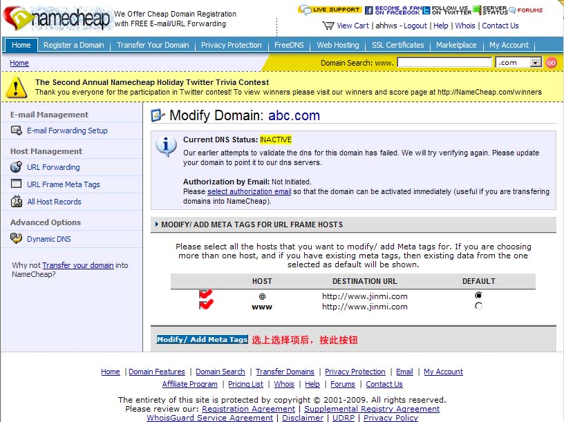 步驟9:在此進(jìn)行轉(zhuǎn)發(fā),將下圖中所示的“www.jinmi.com”改成你的目標(biāo)網(wǎng)址(不改行不行?行!反正我沒意見),右邊下拉框是解析類型,“URL Redirect”是顯性轉(zhuǎn)發(fā),“URL Frame”是隱性轉(zhuǎn)發(fā),如果你不知道兩者的區(qū)別,建議都試一下,實(shí)踐是檢驗(yàn)真理的唯一標(biāo)準(zhǔn)嘛。還有別的選項(xiàng)你不知道是什么意思?那我也不知道(我不費(fèi)口舌了),反正與轉(zhuǎn)發(fā)無關(guān)。