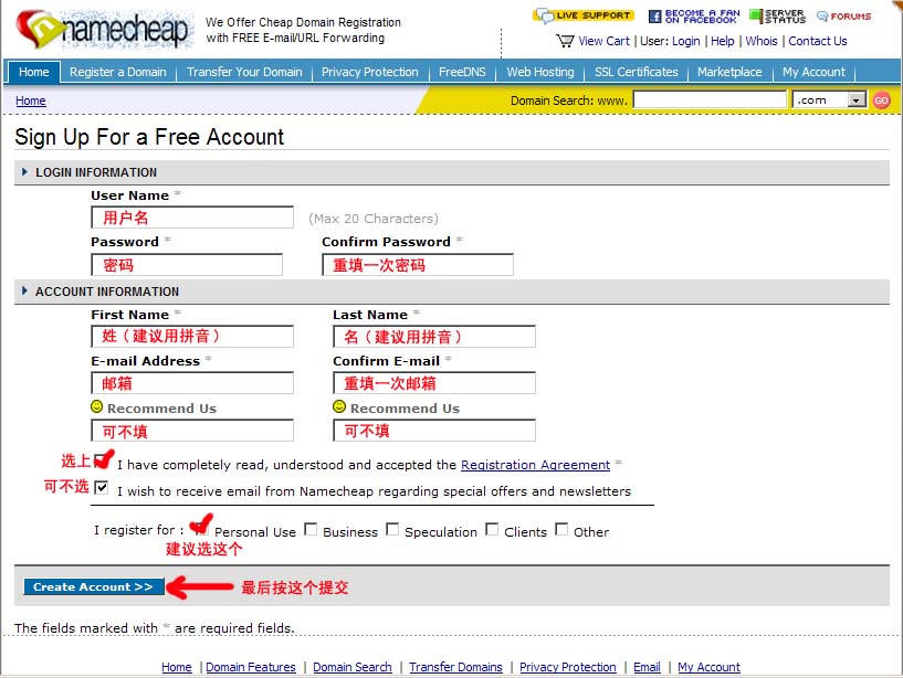 步驟1:打開www.namecheap.com,按圖中箭頭所指,首先注冊(cè)一個(gè)帳戶。