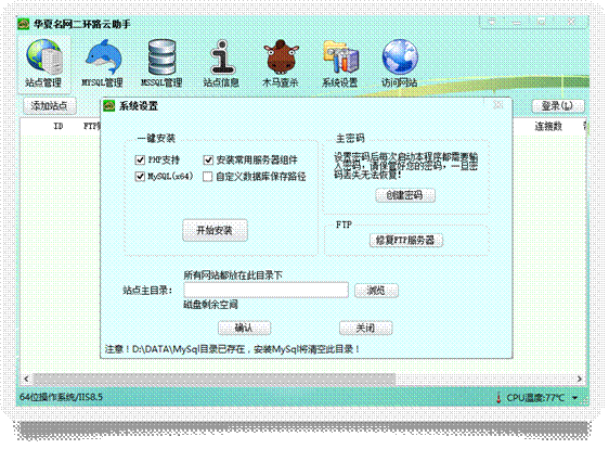 只需輸入FTP賬號(hào)就能快速建立WEB站點(diǎn),并可同時(shí)建立數(shù)據(jù)庫和進(jìn)行其他高級(jí)設(shè)置。
