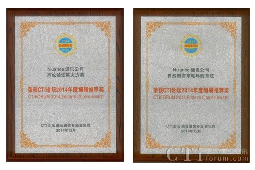 Nuance 通訊公司宣布,由CTI論壇主辦的2014年度CTI論壇“編輯推薦獎(jiǎng)”評(píng)選結(jié)果揭曉,Nuance憑借其領(lǐng)先的語(yǔ)音技術(shù)再次斬獲殊榮,聲紋驗(yàn)證解決方案和自然語(yǔ)言來(lái)電導(dǎo)航系統(tǒng)均獲得2014年度 “編輯推薦獎(jiǎng)”。