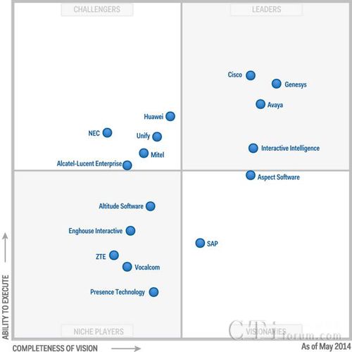 第一象限:領(lǐng)導(dǎo)者(Cisco、Genesys、Avaya、Interactive Intelligence)