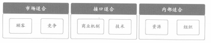 圍繞著戰(zhàn)略的6個要素有顧客、競爭、商業(yè)機制、技術、資源、組織。6個要素中,把適合于顧客和競爭狀態(tài)的戰(zhàn)略稱為市場適合,適合于商業(yè)機制和技術的戰(zhàn)略稱為接口適合,適合于資源和組織的戰(zhàn)略稱為內(nèi)部適合。