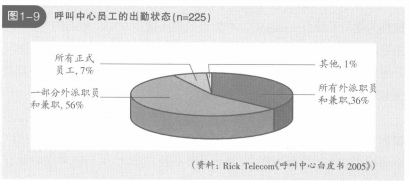 從Rick Telecom的實(shí)際狀態(tài)調(diào)查(2005年)中可以看出,呼叫中心所有業(yè)務(wù)都雇用本公司的正式員工來做的還不到總數(shù)的10%。而全部或部分雇用派遣員工、兼職、臨時工的呼叫中心占總數(shù)的90%以上(見圖1-9),雖然雇用非正式員工可以降低人員開支,但是和正式員工相比,更容易離職、跳槽。