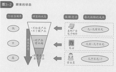 另外,選擇渠道的時(shí)候,還應(yīng)注意顧客的狀態(tài)(見(jiàn)圖3-2)o這里所說(shuō)的狀態(tài),是對(duì)商品的理解、興趣等的程度,和購(gòu)買(mǎi)商品的可能性(行動(dòng)概率)。若在讓顧客認(rèn)知商品的階段,即購(gòu)買(mǎi)可能性極低的階段,就開(kāi)始讓推銷(xiāo)員行動(dòng),不僅是無(wú)論多少人手都不夠,而且只會(huì)令對(duì)商品沒(méi)興趣的顧客感到厭煩。因此,商品認(rèn)知、理解就讓媒體廣告、直郵廣告和電子郵件等負(fù)責(zé),對(duì)于表示出有興趣的(比如申請(qǐng)資料者)購(gòu)買(mǎi)可能性相對(duì)較高的對(duì)象,則應(yīng)該優(yōu)先進(jìn)行電話聯(lián)絡(luò)和推銷(xiāo)員拜訪。