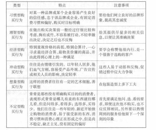 根據(jù)客戶的性格,可以將客戶的購買行為劃分為如表2-1所示的幾種類型。
