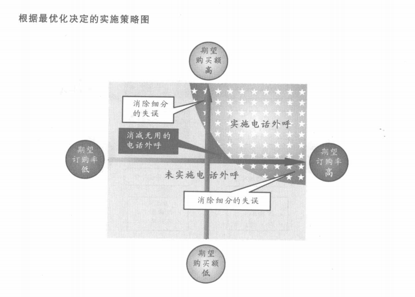 最優(yōu)化是為了使收益最大化而決定對每位顧客實施的策略。具體是分別算出每位顧客的期望訂購率、購買額和期望收益額,并計算出達到最大收益額的實施策略。根據(jù)最優(yōu)化決定的實施策略圖如下頁。為了收益的最大化對單位顧客實施策略,會對細分中的困境帶來兩種效果的改善。第一種效果是消除無謂的失誤,即使對在細分中由于部分的差異無法實施電話外呼的顧客,只要看得到最優(yōu)化對于提升收益額的作用,就能將實施電話外呼的失誤降到最??;第二種效果是減少無用的電話外呼,如果無法預見最優(yōu)化對提升收益額的效果,即使是重要區(qū)域的顧客,也不實施電話外呼。這樣就能使對無收益無貢獻的電話外呼數(shù)量最小化,合理控制成本。