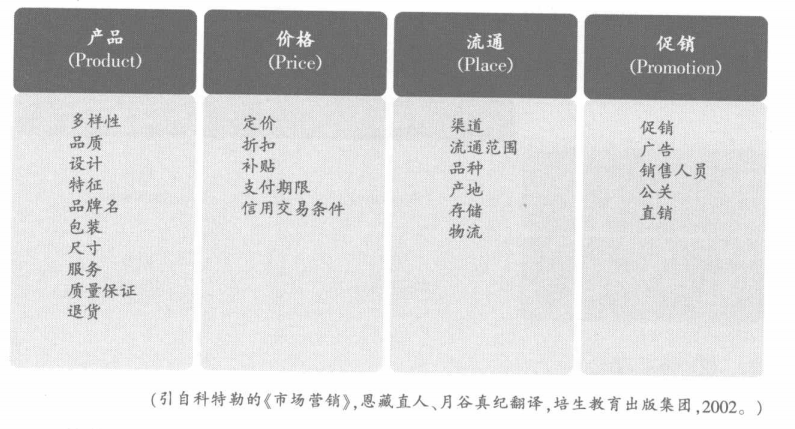 理念明晰后,再?zèng)Q定市場(chǎng)營(yíng)銷組合,制定出具體的市場(chǎng)營(yíng)銷計(jì)劃。所謂市場(chǎng)營(yíng)銷組合是指整合概念后得出的4P——產(chǎn)品(Product)、價(jià)格(Price)、渠道(Place)、推廣(Promotion)的組合,從而產(chǎn)生相乘效果。