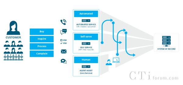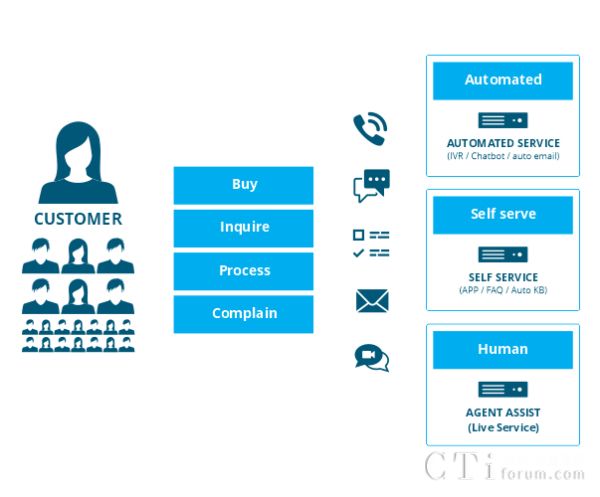 在這個(gè)連接的最后是實(shí)際的服務(wù),但是首先我們需要決定服務(wù)應(yīng)該是自動(dòng)化的、自助的還是人工的。這可能是動(dòng)態(tài)的,并基于許多內(nèi)部和外部因素,包括時(shí)間、資源可用性、技能、產(chǎn)品、客戶類型和銷售階段。