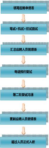 | 2、制定招聘計劃 3、聯(lián)系招聘渠道 | 詳細確定每一期/每月招聘工作的完成計劃,具體包括:招聘崗位、招聘渠道、招聘數(shù)量、招聘周期、負責人員、崗前培訓開始時間等。 | 1、在招聘管理功能模塊中設(shè)置招聘計劃表標準版式、填制規(guī)則及通知(發(fā)布)流向。 2、每期/每月招聘前,手動在招聘管理功能模塊預(yù)置的招聘計劃表中填制并正式通知(發(fā)布)。 | 《XXX呼叫中心招聘計劃表》 | 詳見第二章《呼叫中心精細化運營管理體系》-第二節(jié)《過程精細化管理》-理流程-招聘管理流程規(guī)范-配套文檔二 | |