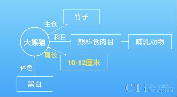 那如果是機器人,它會怎么回答?機器人沒見過大熊貓,除非你給他植入機器視覺。描述大熊貓有很多信息,這些信息都是非結構化數(shù)據(jù),你寫出來的文字、你讀過的文檔都是非結構化數(shù)據(jù),若沒有經(jīng)過處理和整理,你要花很多時間去讀、去看、去理解才行,但我們用知識圖譜將其轉變?yōu)楦拍罨谋硎痉绞?,就會變成下面這個樣子: