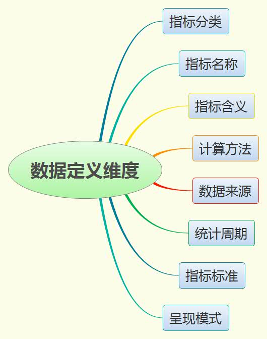 在數(shù)據(jù)分類完成的基礎(chǔ)上,需要進(jìn)一步對各類別下的所有數(shù)據(jù)指標(biāo)項目進(jìn)行定義。定義的目的-由系統(tǒng)平臺根據(jù)數(shù)據(jù)指標(biāo)定義,完成數(shù)據(jù)的自動提取、加工計算和結(jié)果呈現(xiàn)。數(shù)據(jù)定義的維度包括: