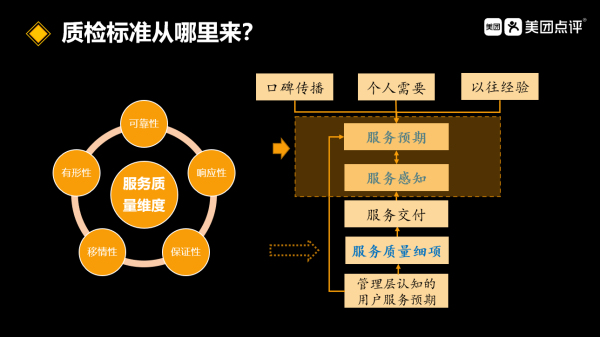 這個模型就是服務(wù)質(zhì)量差距模型,也可以簡單地叫5Gap模型,是上個世紀八九十年代的時候,由美國的幾位營銷專家所提出來的。今年,整個美團的服務(wù)體驗部把這個模型重新拿出來進行了整體的深度思考,創(chuàng)建和演變出了很多戰(zhàn)略規(guī)劃以及項目。我們有這樣的一個認知是,如果每一層服務(wù)只對其自己上游的一個節(jié)點,衰減和差距是很難被填平的。但是,如果每一層設(shè)計每一層交付都直接對齊的是顧客需求,按照服務(wù)的預(yù)期設(shè)定每一層的標準,那么過程中的衰減就會很少,我們就能更大程度上地去滿足我們的服務(wù)觸達,保證達到顧客的服務(wù)預(yù)期。