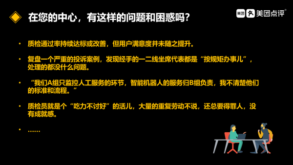 在我們開始分享之前,想請大家一起來回顧一下,在大家的中心有沒有遇到過這樣的問題和困惑?比如說我們的質(zhì)檢通過率其實是很高的,但是顧客滿意度并沒有隨之呈現(xiàn)一個正相關(guān)的局面。比如說我們要去復(fù)盤一個非常嚴重的投訴的案例,但卻發(fā)現(xiàn)所有經(jīng)手的坐席都是按規(guī)矩辦事的,處理沒有問題,找不出來什么毛病。比如說一個客戶在智能機器人的環(huán)節(jié)問題沒有得到很好的解決,然后他通過一個特別繁瑣的IVR的過程到了人工的處理環(huán)節(jié),那么人工階段的質(zhì)檢員能夠知道,在這之前客戶曾經(jīng)受過怎樣的委屈嗎?也就說,每一個環(huán)節(jié)的單渠道的質(zhì)檢,是能夠拼湊起一個完整的客戶體驗視角的旅程,還是說大家只是各玩各的,各形成一套自己的質(zhì)檢方案,甚至可能有一些點其實是沒有被質(zhì)檢到的。還有一點,在美團的COPC認證過程中,崔老師發(fā)現(xiàn)質(zhì)檢員并不是一線坐席理想的一個晉升通路。這個引起我們深刻反思。如果質(zhì)檢員沒有成為一個非常有成就感以及我們一線員工渴望的一個晉升路徑的話,一定是我們的質(zhì)檢員沒有在這個過程中體現(xiàn)出成就感和價值感。如果沒有很好地用到質(zhì)檢員這么好的武器的話,一定是我們之前的體系出了問題。所以,如果您的中心也曾經(jīng)有同樣的問題,那么就邀請大家和我一起感受和回顧一下,我們所經(jīng)歷的嘗試去改變這些事情的心路歷程。