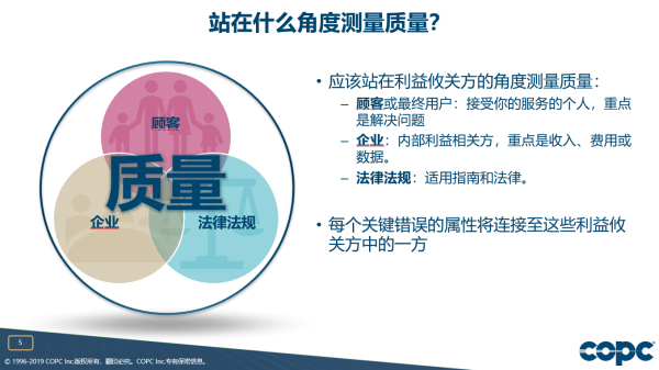 剛才提到了COPC有三大關(guān)鍵錯誤,顧客關(guān)鍵錯誤準確率、業(yè)務(wù)關(guān)鍵錯誤準確率和合規(guī)關(guān)鍵錯準確率這三大關(guān)鍵錯誤準確率的概念。作為高績效的公司,首先就應(yīng)該在組織內(nèi)部重點關(guān)注如何有效地降低關(guān)鍵錯誤。因為,關(guān)鍵錯誤降低了,就代表了顧客滿意度會有一些提升,企業(yè)的運營成本有可能會降低,收入會提高,潛在的法律風(fēng)險會減少。