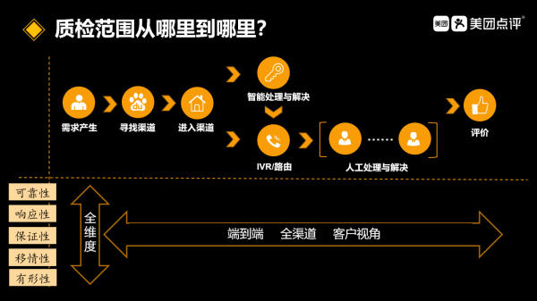 對于美團來講,可以由顧客來選擇,是進入在線智能,還是直接撥打電話進入IVR。IVR本身也具有一定的解決能力和預(yù)判能力。如果兩邊都沒有解決問題,顧客會流到人工環(huán)節(jié),人工會有首輪多輪,中間可能還有升級和流轉(zhuǎn)。最后,當(dāng)問題被解決后,會有一個評價的過程。如圖所示,是一個簡版的服務(wù)歷程。假設(shè)我們把跟隨顧客腳步的一個時間進程當(dāng)成橫軸,縱軸是質(zhì)量維度的五個方面,這樣就產(chǎn)生了一個矩陣。矩陣的橫軸是客戶所接觸到的每一個觸點,縱軸就是服務(wù)質(zhì)量維度的每一個方面,從而保證從橫向上是端到端的全渠道顧客視角,從縱向上是一個全維度的質(zhì)檢范圍。