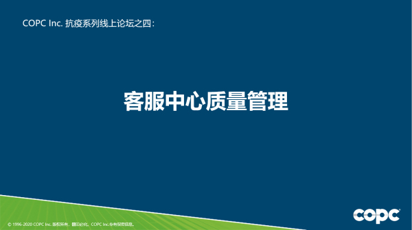 質(zhì)量管理作為顧客聯(lián)絡(luò)中心運營管理的重要一環(huán),是顧客聲音反饋的重要渠道,也是內(nèi)部流程改善的重要抓手。質(zhì)檢如何切實做到以服務(wù)提升為目的,以顧客為中心,將顧客的體驗放在第一位,從顧客的視角來出發(fā)構(gòu)建企業(yè)服務(wù)的流程,以績效管理體系作為框架和考核參照,從而實現(xiàn)呼叫中心全面質(zhì)量管理?5月7日,COPC系列研討會第四期--客服中心質(zhì)量管理中,COPC陳登峰老師和美團點評服務(wù)體驗部持續(xù)改善負責(zé)人烏婷婷女士為大家分享了優(yōu)秀實踐經(jīng)驗,以下是研討會精彩內(nèi)容。