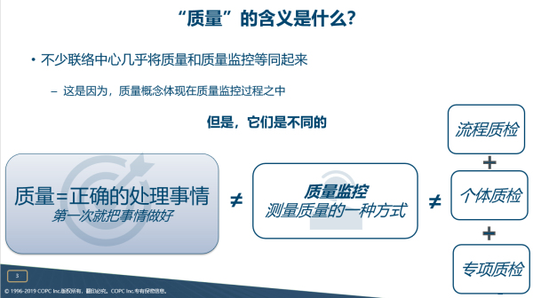 很多質(zhì)檢團隊的同學(xué)說,質(zhì)檢好像感覺挺重要,但是在公司又好像一直都不受重視。到底質(zhì)檢重要不重要?其實,這個問題的答案是要看質(zhì)檢團隊為整個公司和組織創(chuàng)造了什么樣的價值。我們是在哪個層面上解決問題?是從顧客體驗、流程優(yōu)化的角度出發(fā)去審視整體的質(zhì)量?還是花費大量的精力拼命聽錄音找客服代表個體問題?質(zhì)檢的站位決定了價值。所以COPC期望,質(zhì)量的負責(zé)人也好,質(zhì)量的團隊也好,一定要先去關(guān)注流程層面的質(zhì)檢,再去覆蓋個體和專項質(zhì)檢。