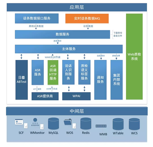 數(shù)據(jù)層提供了數(shù)據(jù)接入能力,接入了Kafka、WMB(58自研消息總線)實(shí)時話務(wù)數(shù)據(jù),并提供了質(zhì)檢話務(wù)數(shù)據(jù)接口服務(wù),實(shí)現(xiàn)對實(shí)時錄音數(shù)據(jù)、離線語音數(shù)據(jù)的多種數(shù)據(jù)格式質(zhì)檢、存儲支持。