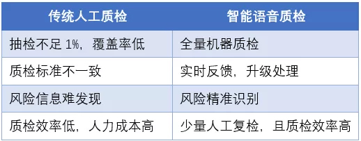 智能語音質(zhì)檢一般采用機(jī)器質(zhì)檢與人工復(fù)檢相結(jié)合的方式,會覆蓋客戶和坐席的每一句話,可以很好地輔助提升人工坐席的服務(wù)質(zhì)量,智能語音質(zhì)檢相比傳統(tǒng)語音質(zhì)檢具有以下優(yōu)勢: