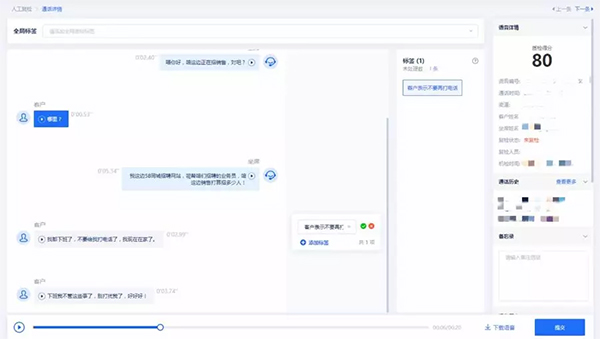 質(zhì)檢員在標(biāo)簽欄可以看到質(zhì)檢系統(tǒng)給出的標(biāo)簽,點(diǎn)擊標(biāo)簽可以直接定位到標(biāo)簽的說話內(nèi)容,點(diǎn)擊說話內(nèi)容左側(cè)的播放按鈕可以聽這句話的錄音,同時最下側(cè)的錄音進(jìn)度條也會移動到相應(yīng)位置。質(zhì)檢員不僅可以很快地復(fù)檢標(biāo)簽內(nèi)容,也可以通過快速瀏覽文字檢查質(zhì)檢系統(tǒng)未覆蓋到的內(nèi)容并手動添加標(biāo)簽,復(fù)檢結(jié)果會存入數(shù)據(jù)庫中供后續(xù)分析使用。傳統(tǒng)的人工質(zhì)檢,質(zhì)檢時邊聽錄音邊做記錄,一通語音要反復(fù)聽好幾遍才會有一個質(zhì)檢結(jié)果,效率非常低下。相比于傳統(tǒng)的人工質(zhì)檢方式,使用復(fù)檢系統(tǒng)的人效提高2至3倍。