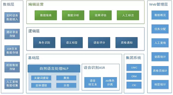 語音質(zhì)檢架構(gòu)包括基礎(chǔ)能力層、數(shù)據(jù)層、邏輯層、編輯運(yùn)營層和Web管理層,如下圖所示: