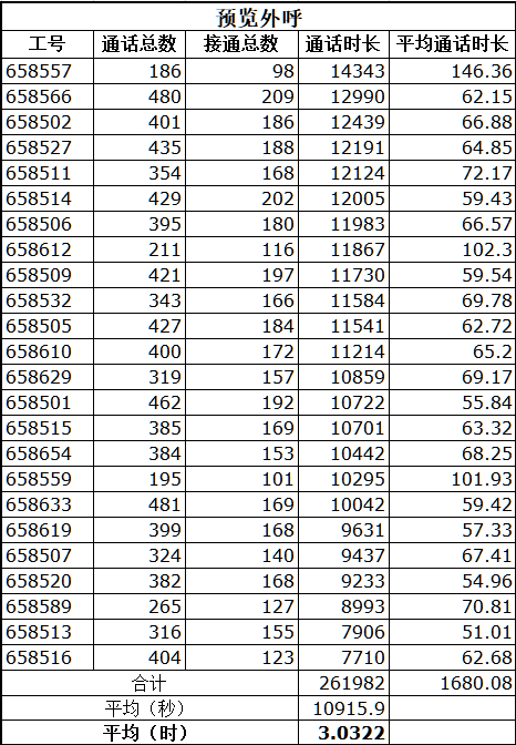 那以某外呼業(yè)務(wù)實測數(shù)據(jù)為例,號碼接通率不到50%,使用預(yù)覽外呼的座席,每天的平均通話時長是3小時,詳細(xì)數(shù)據(jù)如下表: