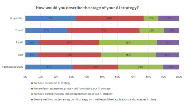 最后,在AI戰(zhàn)略制定中,旅行和醫(yī)療健康在其他三個行業(yè)中得分最低。目前,旅行和醫(yī)療健康報告的公司分別只有26%和23%處于完全實施或早期實施AI戰(zhàn)略的公司。酒店業(yè)目前有33%的公司沒有特定的AI戰(zhàn)略,而旅行社報告的公司中有27%的公司沒有特定的AI戰(zhàn)略。