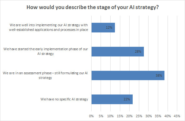 該調(diào)查顯示,金融領域的AI戰(zhàn)略配置略有不同,盡管仍然很強。共有39%的受訪者表示他們對AI戰(zhàn)略的實施非常滿意(10%)或已開始實施AI戰(zhàn)略(29%)。但是,有些令人驚訝的是,目前有31%的金融機構(gòu)報告說沒有特定的AI策略。無AI策略的百分比是電信和零售無AI策略數(shù)字的三倍以上。