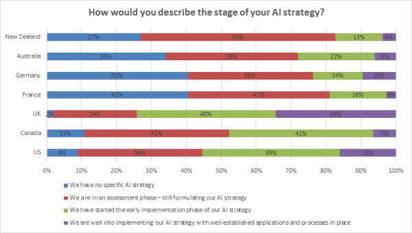 在逐個國家的基礎上查看AI戰(zhàn)略計劃,發(fā)現(xiàn)各國在準備CX AI計劃方面存在很大差異。如下圖2所示,英國,美國和加拿大似乎在為CX環(huán)境中AI的出現(xiàn)做準備方面做得最多。英國是一個明確的領導者,超過三分之一(34%)的CX經(jīng)理報告說他們很好地實施了AI戰(zhàn)略,另有40%的經(jīng)理表示他們已經(jīng)開始了AI戰(zhàn)略的早期實施階段。美國緊隨其后的分別是16%和39%。在AI方面排名第三的國家是加拿大,其中7%的經(jīng)理說他們的公司已經(jīng)很好地實施,而41%的人則說處于AI的早期實施階段。來自調(diào)查的其余國家(包括澳大利亞,法國,德國和新西蘭)的受訪者表示,其管理人員中有50%以上仍在制定策略或目前沒有特定的AI策略。