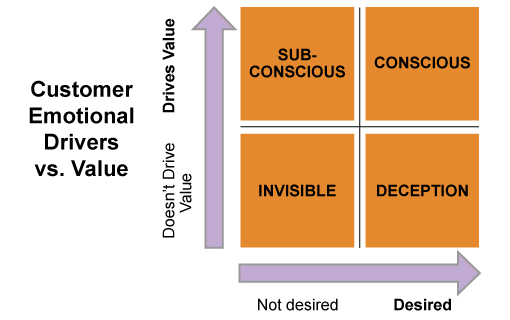 潛意識--這些是客戶不會說他們想要但實(shí)際上推動價值的事情。這就是情感所在,在客戶不清楚的價值觀中。
