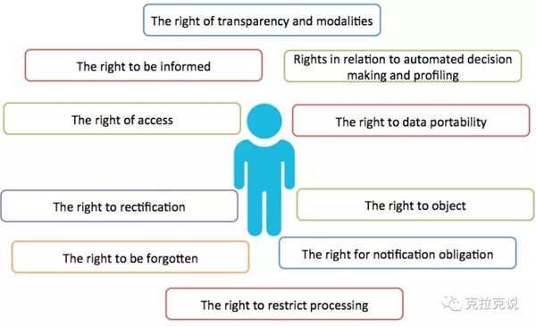 個(gè)人和企業(yè)之間分別可以對這些數(shù)據(jù)進(jìn)行怎樣的伸張和利用?歐洲GDPR可以告訴我們?nèi)绾稳?shí)踐。消費(fèi)者擁有最基本的信息的被告知權(quán)、選擇權(quán)和遺忘權(quán)。所謂的被告知權(quán)就是說當(dāng)消費(fèi)者開始瀏覽網(wǎng)頁或者通話時(shí),企業(yè)必須明確告知數(shù)據(jù)會被你收集、記錄和存儲。進(jìn)一步延伸而來選擇權(quán)定義了消費(fèi)者可以要求企業(yè)對其數(shù)據(jù)有不被收集、記錄和存儲的權(quán)利。而遺忘權(quán)就更厲害了,相應(yīng)的數(shù)據(jù)在生成之后,消費(fèi)者可以主動致電聯(lián)系企業(yè),要求對自己所參與生成的這些數(shù)據(jù)選擇部分/全部遺忘。真是妥妥滴消費(fèi)者至上利益保護(hù)!