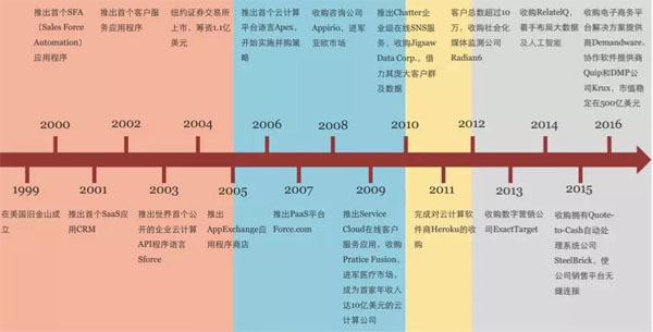上圖為Salesforce的發(fā)展路徑,來源于六度人和(EC)研究整理