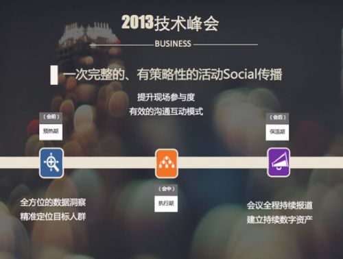 這家企業(yè)利用social touch 完整的社會化活動管理解決方案,在活動前期可以全方位的通過數(shù)據(jù)洞察來定位目標人群以及關(guān)鍵意見領(lǐng)袖,進行有針對性的邀請。通過活動管理后臺設(shè)定活動主題、相關(guān)嘉賓的演講內(nèi)容和會議流程,并通過HTML5頁面進行展示。并利用微博、微信以及官網(wǎng)等平臺,向目標人群進行推廣報名。不同渠道的報名人員的信息統(tǒng)一匯總到后臺的系統(tǒng)當中。