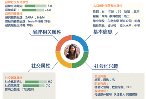管理我們的每一個受眾,首先就是要對我們的受眾進行描述,包括他的基本信息,比如性別、年齡、地域、星座等人文統(tǒng)計學(xué)的信息,以及畢業(yè)學(xué)校、教育信息、職位、收入水平等,或者是他的社會化的興趣、生活興趣、社會興趣、媒體傾向等。由于每一個人都有他的自媒體屬性,所以我們要對每一個人都有一個社會化的描述,包括他的社會化影響力和社交活躍度。當消費者與品牌產(chǎn)生了關(guān)聯(lián)之后,我們還會對他的品牌的喜好程度、以及感興趣的品牌和曾經(jīng)消費過的品牌進行多維度的補充。
