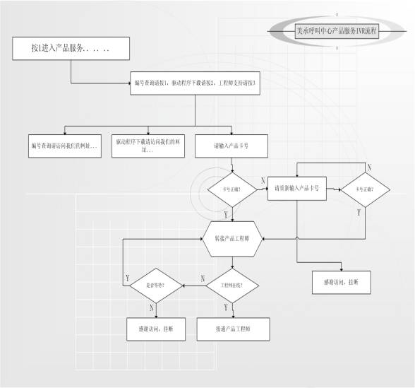 IVR系統(tǒng)是呼叫中心系統(tǒng)中極為重要的一環(huán)。作為面向用戶的窗口,IVR的語音交互方式引導(dǎo)用戶進(jìn)入不同的業(yè)務(wù)流程,聽取相關(guān)信息。清晰,流暢,禮貌而又有層次的IVR語音會給用戶留下深刻的印象。美承的IVR系統(tǒng)在設(shè)計上參照了其他成功的客服中心的經(jīng)驗,充分考慮了用戶的習(xí)慣,在流程上具有鮮明的特點,以下以產(chǎn)品服務(wù)為例: